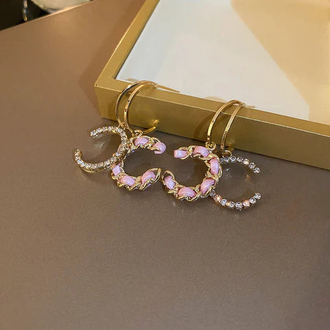 Aretes tipo argolla de diamantes + pendientes doble c (COMPRA 1 PAR LLEVA 2)