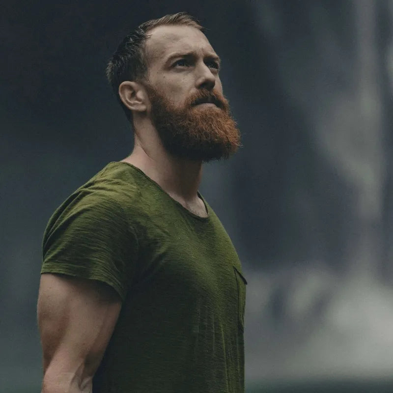 Hombre con barba mirando hacia arriba, vistiendo una camisa verde en un entorno brumoso.